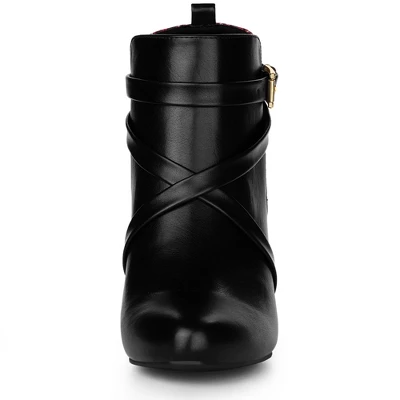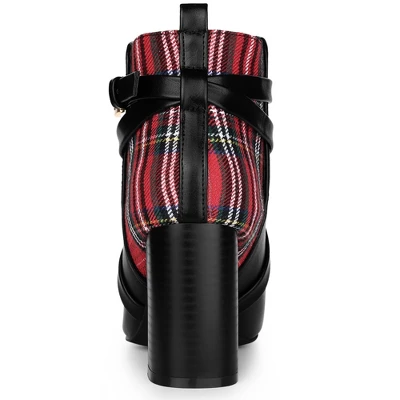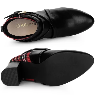 Featuring a solid block heel for an easy slip-on, these plaid paneled boots are stylish and on-trend, making them easy to match any outfit. Ankle Boots; Chunky Heels; Pointed Toe; Plaid Decor; Slip-On; Vamp: Faux Leather +Fabric; Outsole: Rubber; Heel: ABS; Heel Height: 3 5/9 inches; Shaft Height: 3 8/9 inches.