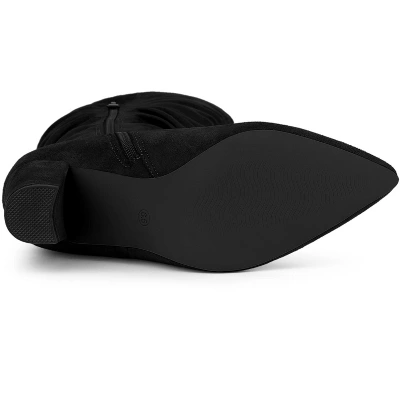A silhouette updates a fashion-forward knee-high boot without a zipper lofted by a block heel and finished with a classic, pointy toe. These boots pair perfectly with your winter dresses. These knee-high boots are perfect for casual walking and lounging around. Knee High Boots; Block Heel; Side Zipper; Pull-on; Low Heels; Vamp: Faux Suede; Outsole: Rubber; Heel: ABS; Heel Height: 3 1/3 inches; Shaft Height: 15 inches.