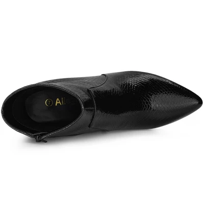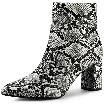 Introduce some heat this winter with these chic pointy-toe block-heel ankle boots rendered in faux leather and featuring a snake print that allows for ease of wear. Well paired with mini skirts and dresses. These Comfortable Ankle Boots are fashionable and functional, and they are a must-have this season, especially at Christmas. Shaft Height: 4 3/4 inches.