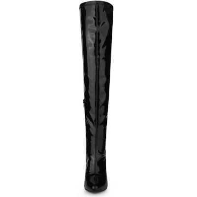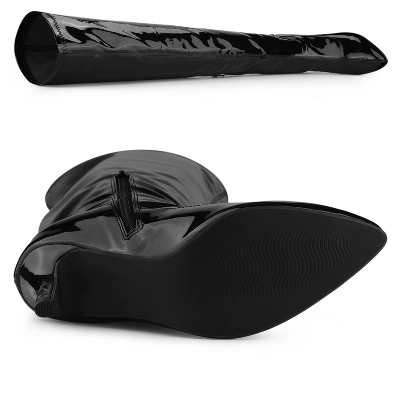 Adorned in patent leather, these pointed-toe stiletto over-the-knee boots are cute and stylish, making your ankles and thighs more elegant and showing off your long legs. Over Knee High Boots; Stiletto Heels; Patent Leather; Zip Closure; Vamp: Patent Leather; Outsole: Rubber; Heel: ABS; Heel Height: 3 1/3 inches; Shaft Height: 21 2/3 inches.