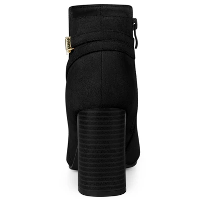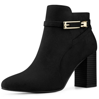 These sleek high-heeled booties put a little pep in your step with a cool buckle strap (but there’s an inside zip for easy on-and-off). High-heeled boots make you more elegant when you go shopping for work or prom. Buckle Ankle Boots; Round Toe; Side Zip; Chunky Heel; Vamp: Faux Suede; Outsole: Rubber; Heel: ABS; Heel Height: 3 5/9 inches; Shaft Height: 3 5/9 inches. Rubber Outsole and ABS heel, anti-slip effectively. Faux suede vamp, makes your boots look more textured. Moderate heel height, make you feel more comfortable.