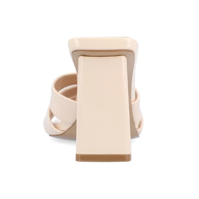 Our Ellington block heeled sandals from Journee Collection will take you from event to event in style. This style is sure to boost your confidence with their patent vegan leather, stacked band design, and open square toe. The padded insole and slip-on feature will leave your feet feeling more comfortable than ever.