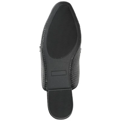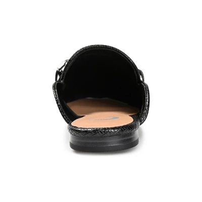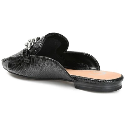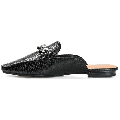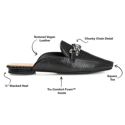 A versatile mule flat that can handle your Monday through Sunday looks the Hazina by Journee Collection. This square toe mule is embellished with a silver-tone chain accent and a notched topline. Lizard textured vegan leather shapes the silhouette and a 4 Tru Comfort Foam� footbed makes them oh-so-comfy. At Journee Collection our flat styles will have you looking just as professional as the boss at work to having the cutest shoes when you go out for the night.