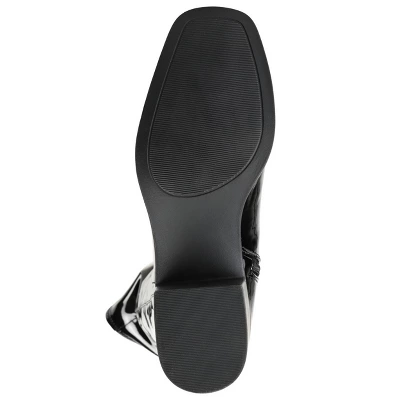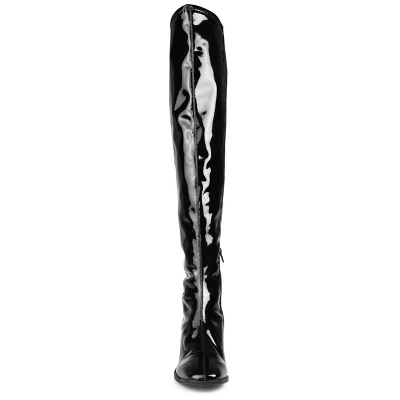 The definition of daring style, the Mariana thigh-high boot by Journee Collection. With a 4 mm Tru Comfort Foam™ footbed and stretchy vegan leather uppers, this wide-calf design offers comfort without compromising on style. A square-toe shapes the look, and a low block heel adds a subtle lift. At Journee Collection, our boot styles will have your outfit looking even better than before. They will give you that finishing touch that will have your outfit looking straight out of a magazine.