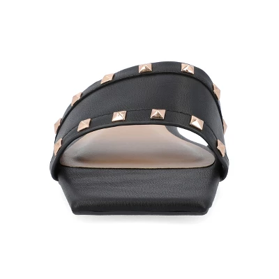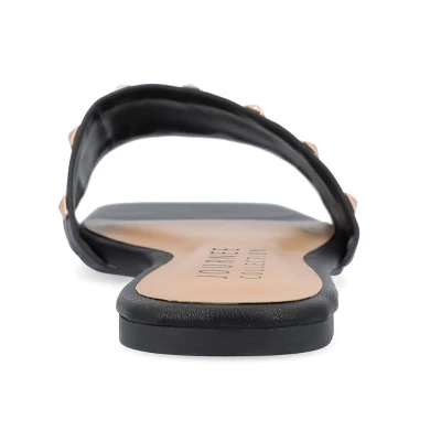 The Treena sandal from Journee Collection will attract compliments wherever you go. Their luxe vegan leather, slide style, single band, stud detail, and open square toe will be a perfect combination of classy yet casual to take you anywhere in style. As a bonus, their slip-on closure and 4 mm Tru Comfort Foamâ„¢ insole will leave your feet comfortable around every corner.