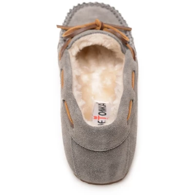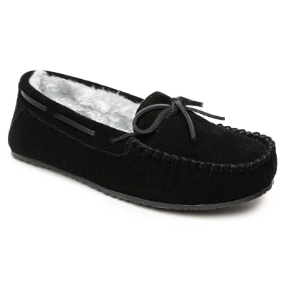 These classic moccasin-style women’s slippers go on with ease. Soft faux fur lining wraps your feet in warmth for cozy days at home. Soft suede or statement-making fabric prints add a touch of cheerful fun to your feet.