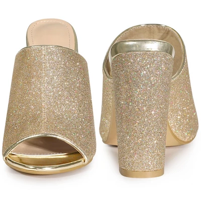 - Open Toe; Slip-on; Glitter; Chunky High Heels; Block Heels; Mules Sandals