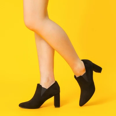 - Ankle Booties; Chelsea Booties, Pointed Toe; Chunky Heels; Slip On Bootie