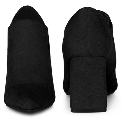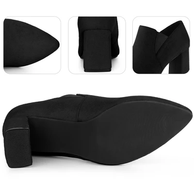 Pointed-toe ankle booties with block heels for all-day comfort. This sculptural pair features classic elasticated sides for easy on-and-off to save you time and these booties that flatter your legs so you’ll be the center of attention. Ankle Booties, Pointed Toe, Slip on. Block Heel Vamp: Faux Suede; Outsole: Rubber; Heel: ABS Heel Height: 3 1/7 inches. Please check the size measurement chart before ordering.