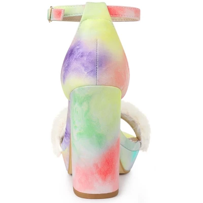 - Open Toe, Buckle Closure, Faux Fur Decor, Tie Dye Upper, Block Heels, Platform Heel Sandal